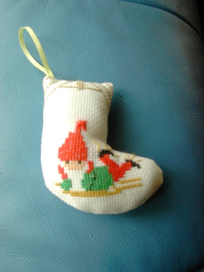 Vor etlichen Jahren brachte mir mein Mann aus den USA ein Kreuzstichbuch mit und daraus habe ich den Weihnachtsmann mit Schlitten gestickt.